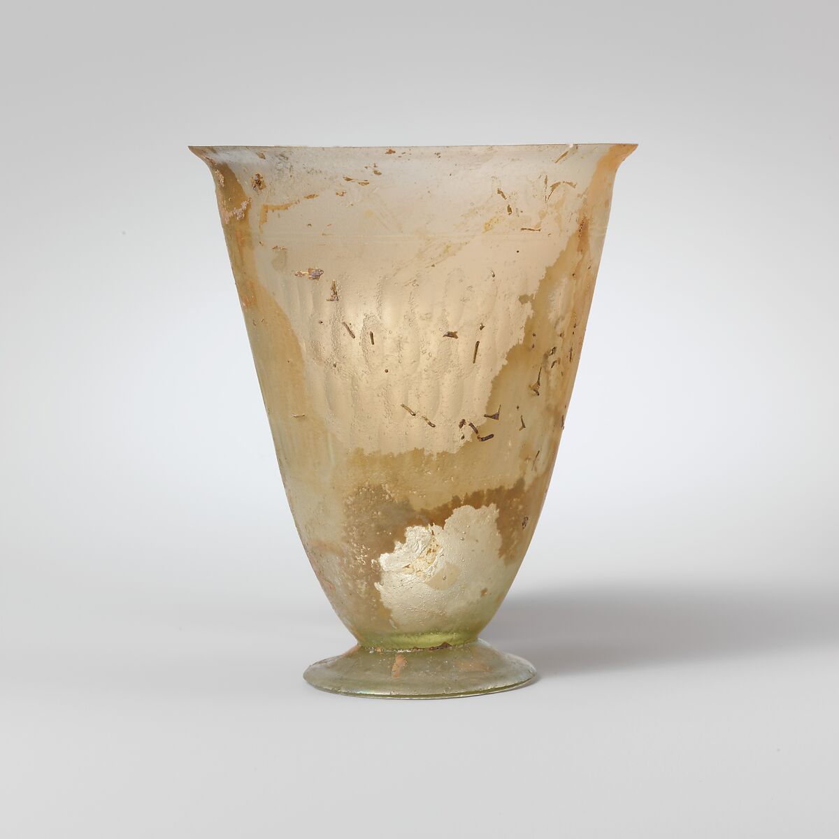 Thin, outsplayed, knocked-off rim; funnel-shaped body, tapering in at base; broad, low, conical, outsplayed foot, made from a separate paraison with a ground outer edge.