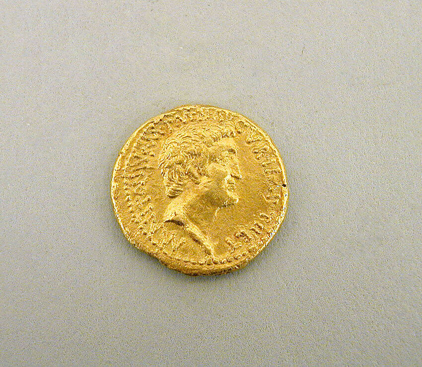 M ANTONIVS M F M N AVGVR IMP TIIRT, head of Mark Antony/COS DIISIGN ITIIR IIT TIIR III VIR R P C, head of Octavia