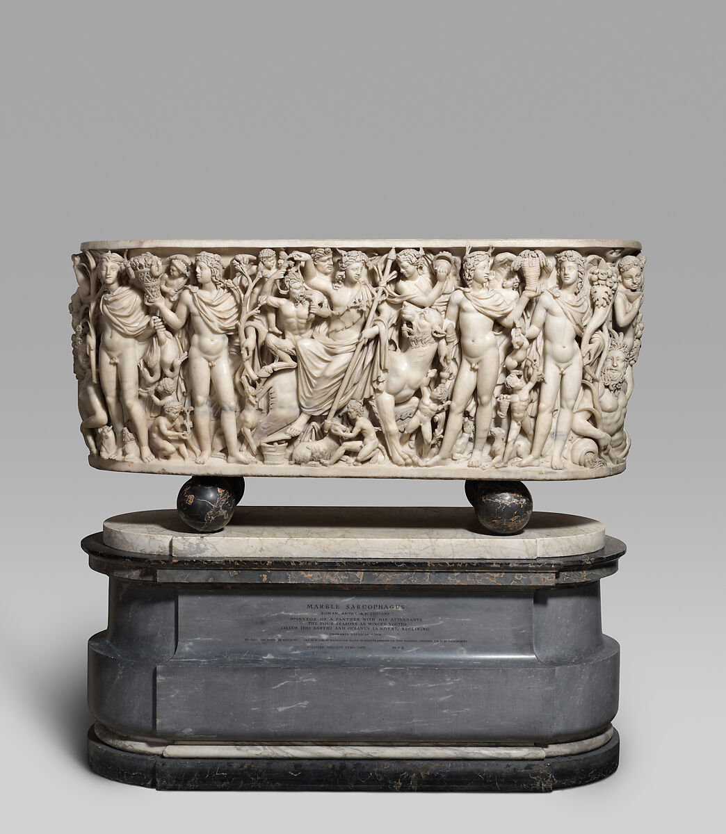 葬送儀礼の美術の出色の作例であるこの石棺は、おそらく裕福な死者のためにローマで彫られたものだと思われます。側面と前面には40を超える人物と動物の像が高浮彫りで表されています。中心にはディオニュソスがヒョウに乗り、左から冬、春、夏、秋の四季を象徴する4人の人物に挟まれています。これら5人の中心人物の周りには、他にバッカスに関連する人物や儀式の品がすべて縮小されて彫られています。丸い両端には、大地と水を人格化したものなど、別の大きな人物のグループが表されています。