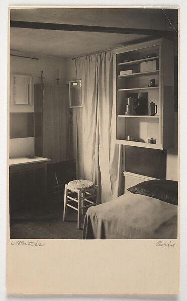 This view of a corner of Piet Mondrian’s studio at 5, rue de Coulmiers is believed to be unique. Printed on carte postale paper, it was given, not mailed, by Kertész to Mondrian in 1926 along with another, more common view of the modernist painter’s studio.