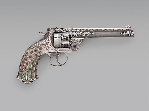This opulent but functional handgun was specially decorated by Tiffany & Co. and exhibited at the World's Columbian Exposition in Chicago in 1893, to showcase the most innovative designs and technically sophisticated works the firm could produce. The revolver is remarkable for the turquoise cabochons and lapis lazuli over its fluted and chased sterling silver grip, and for the lapis lazuli stones set at the sides of the frame hinge. The etched ornamentation of the front sight blade, barrel, and cylinder, which was also designed and executed by Tiffany's, offers a striking contrast to the standard decoration of American firearms of the period, which was normally executed by engraving.