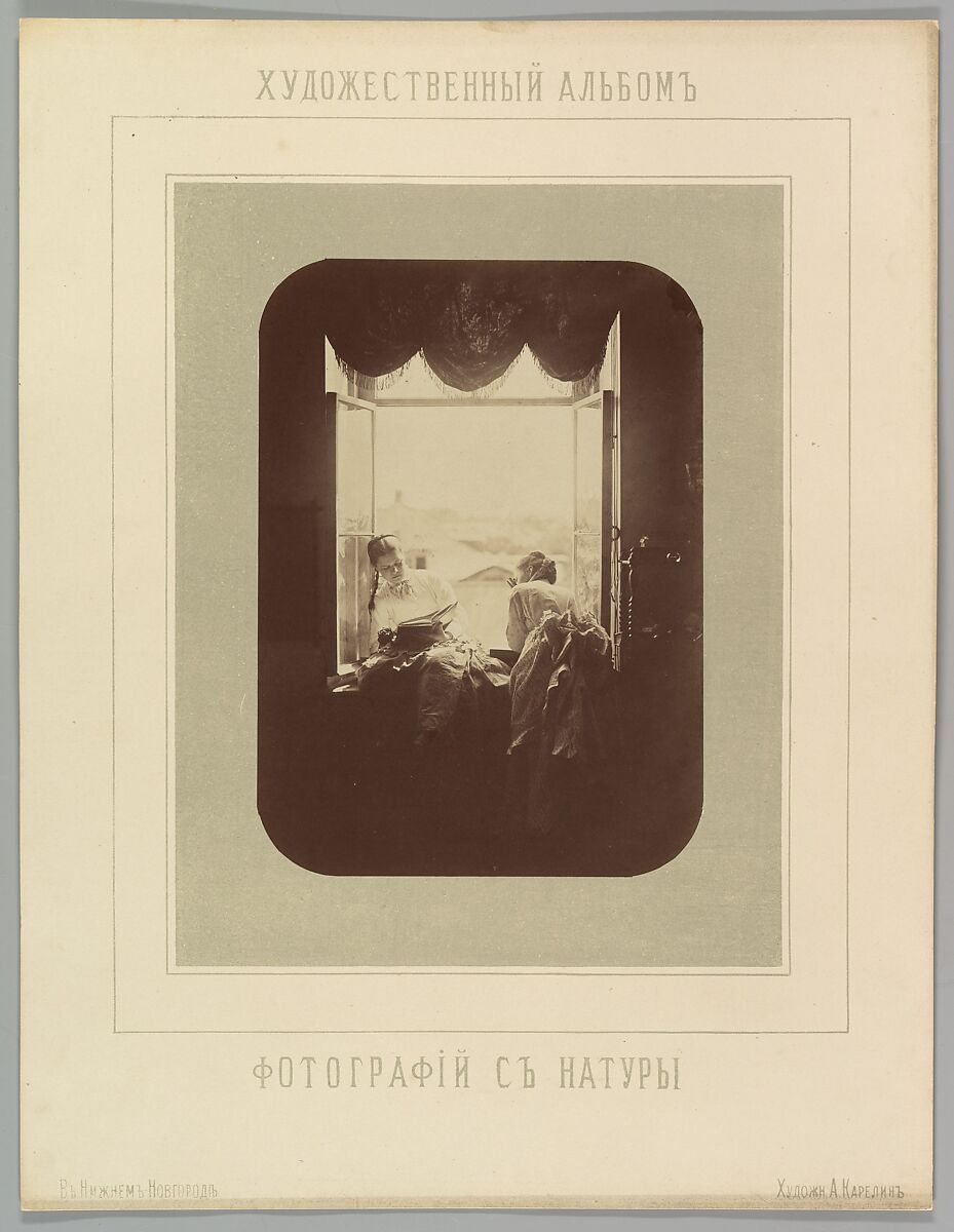 Trained as an icon painter, Karelin operated a photographic studio and drawing school in the provincial town of Nizhny Novgorod. His repertoire included portraits, landscapes, and city views, but his most artistically ambitious photographs were genre scenes staged in domestic interiors, such as this view of two young women before an open window. Like his British contemporary Henry Peach Robinson (1830–1901), Karelin skillfully blended reality and artifice to create picturesque images of provincial bourgeois life.
