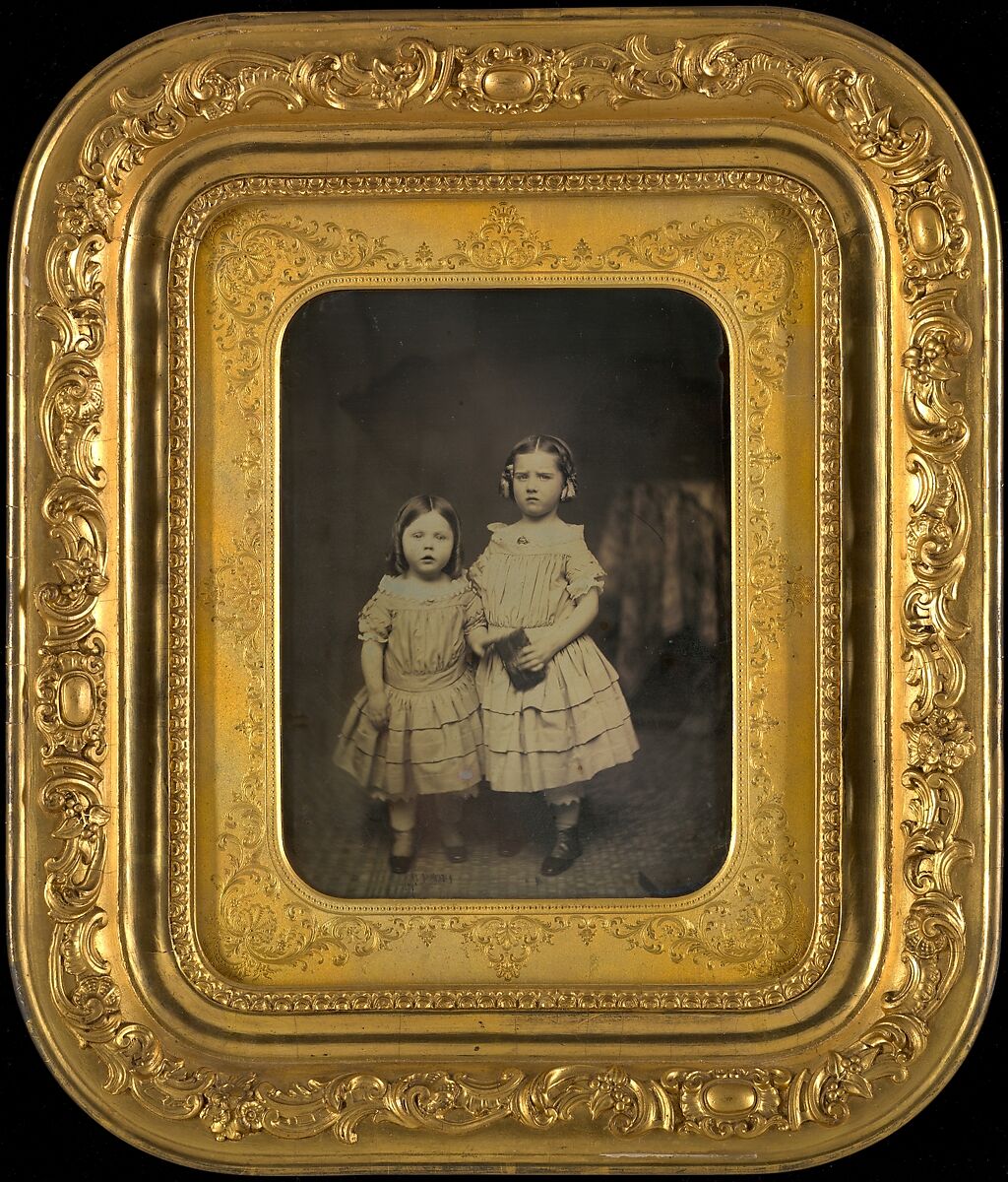 Although the identities of both the maker and the sitters are unknown, the size and lavish presentation of this daguerreotype suggest that the girls were of high social status, and the quality of the daguerreotype indicates an accomplished portrait studio, probably in a major city. While far from a snapshot—the possibility of which was still many decades away—this portrait of two girls (sisters, one assumes) has an air of authenticity and spontaneity of expression and gesture that removes it from the typically stiff, expressionless portraits cranked out by less talented artisans.