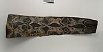 This panel is one of over 270 original paintings commissioned from Kwoma artists in the village of Mariwai in 1970 and 1973 by Douglas Newton, the first curator of Oceanic art in the Department of the Arts of Africa, Oceania and the Americas. Once completed, they were shipped to New York and installed in the galleries. In 2007, when the Oceania galleries at the Metropolitan Museum were renovated, the panels were attached to a new superstructure. Although less steeply pitched than the Kwoma houses found in villages today, the installation evokes the essential form of a ceremonial house ceiling. Together these suspended panels form an impressive and spectacular installation in the Metropolitan Museum which, at 80.4 feet (24.5 meters) end-to-end, is the largest contemporary art installation in the museum.