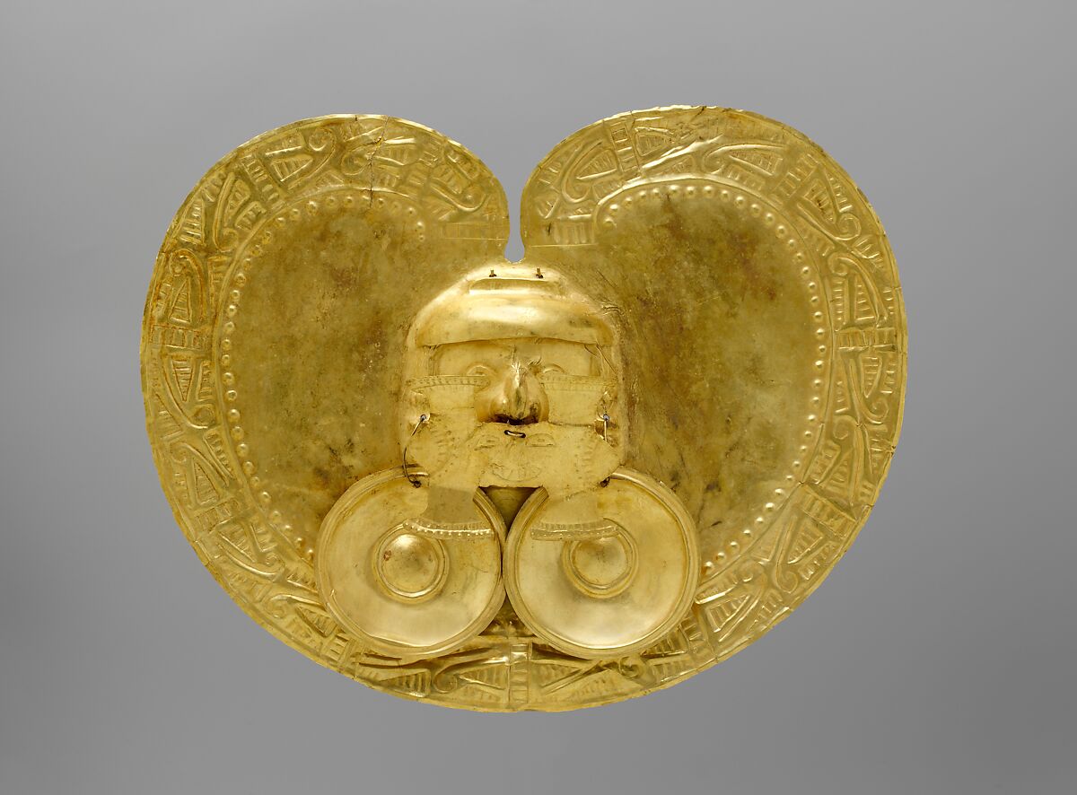 A large H-shaped nose pendant almost entirely obscures the face at the center of this gold, kidney-shaped pectoral. Both the shape of the pectoral and the form of the nose pendant are hallmarks of Yotoco-period Calima art. The Yotoco period was the second of three societies—Ilama, Yotoco-Malagana, and Sonso—to successively occupy the Cauca Valley region in west-central Colombia. The three societies are known collectively as the Calima culture.
