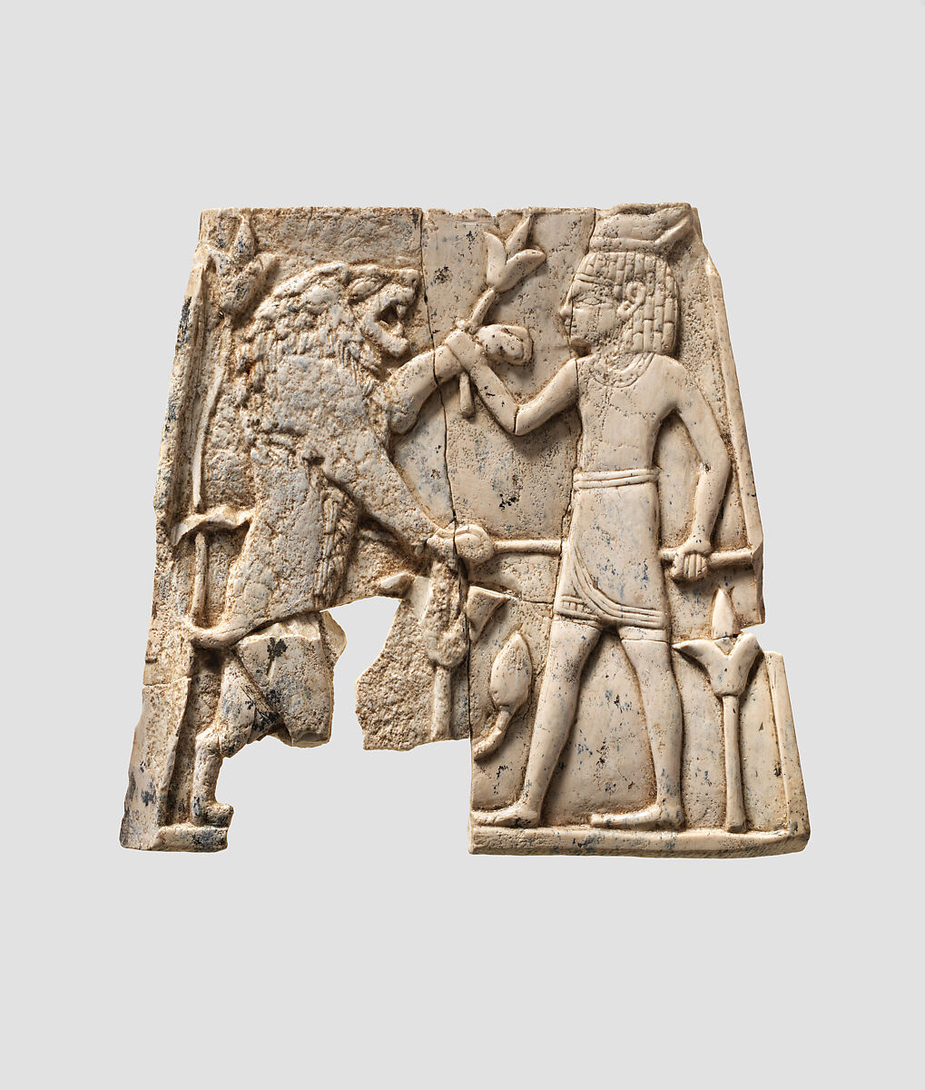 This trapezoidal ivory plaque was found in a storage room in Fort Shalmaneser, a royal building at Nimrud that was used to store booty and tribute collected by the Assyrians while on military campaign. It depicts a male figure, barefoot and dressed in an Egyptian-style kilt and beaded collar, in combat with a rampant lion. The figure wears a short Egyptian wig and a headdress that resembles the Egyptian double crown. He holds a plant stalk with a lily blossom in his right hand and grasps the lion’s foreleg with the same hand, while driving a spear through its abdomen with his left, holding the spear awkwardly behind his own body. Plant stalks topped with lily blossoms grow behind each of the two combatants, and one with an additional branch topped by a bud grows in the field between the two. The lion seems to rest a paw on the lily blossom, or perhaps on the shaft of the spear. Its mouth is open in a roar, and its mane is shown as individual tufts of hair, extending along the shoulder and down the belly, as is typical on Mesopotamian depictions of lions. A raised plain border is preserved on the sides and bottom edge. The surface of the ivory is much more worn on the left side and a large fragment is missing from the bottom edge. Carved ivory pieces such as this were widely used in the production of elite furniture and luxury objects during the early first millennium B.C., and could be overlaid with gold foil or inlaid to create a dazzling effect of gleaming surfaces and bright colors. This piece is one of many elaborately carved ivories with motifs adapted from Egyptian art that have been attributed to Phoenician workshops, as Phoenician art shows strong Egyptian influence. It was found with many other small trapezoidal plaques, suggesting that these pieces were originally fitted together in a hexagonal or octagonal ring that was wider at the bottom than the top. If equipped with bases and lids, these could have been used as boxes, or alternatively they could have served as stands for bowls or round-bottomed goblets.