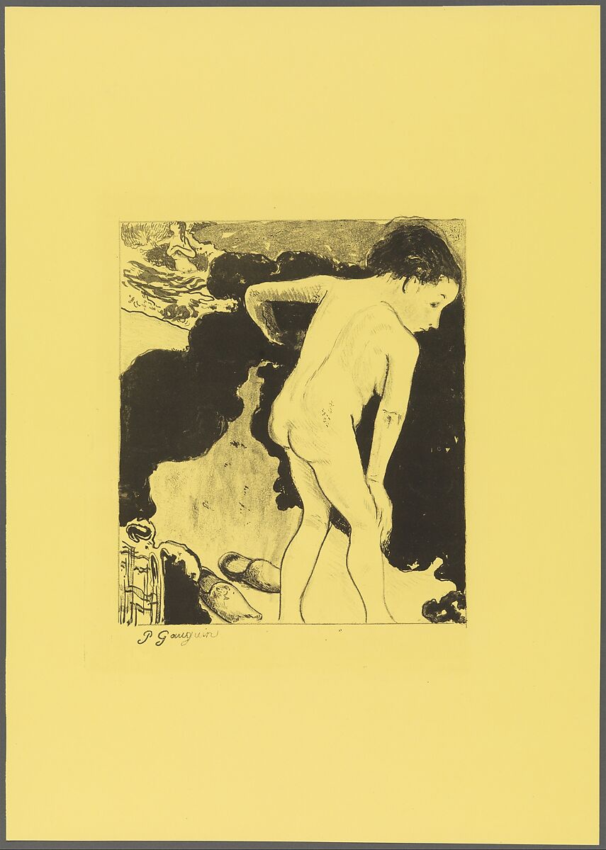 This print was likely inspired by the artist's sojourn in Le Pouldu, a small fishing village near Pont-Aven where he stayed in 1889-90, and shows a nude female figure tentatively approaching the sea. Her rustic clogs (the traditional footwear of Brittany) are discarded on the beach at lower left. The abstract, flowing forms that surround her evoke the wild and rocky shoreline of Brittany's coast. A second bather can be seen in the upper left of the composition, swimming in the waves.