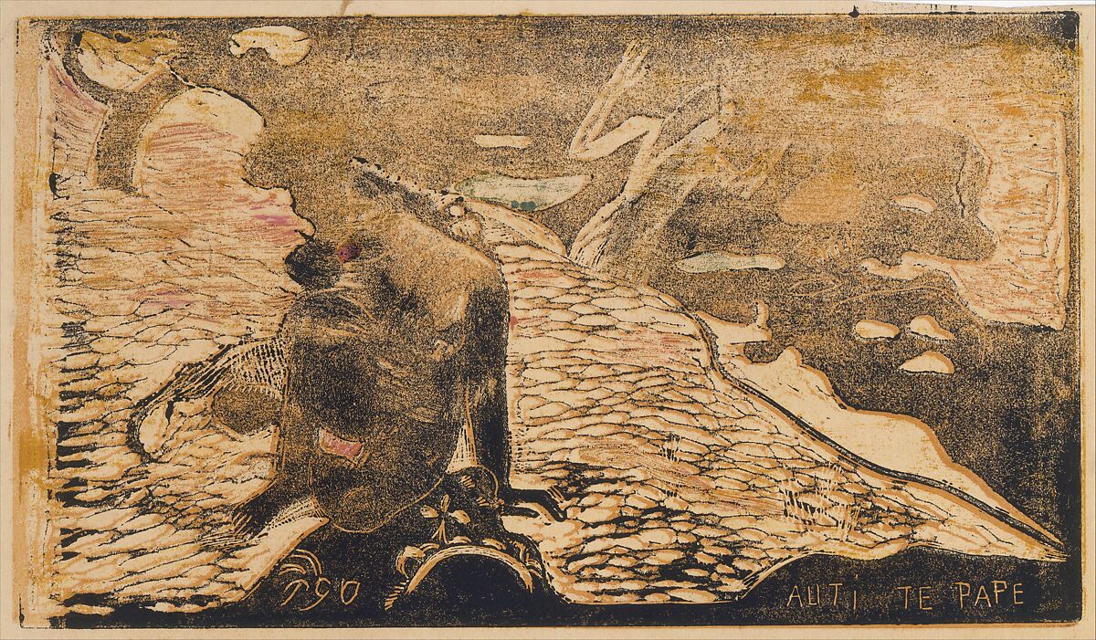 This print shows a female nude seated on a riverbank; a second woman with raised arms prepares to plunge into the river in the background. Images of beautiful young women bathing or lounging beside bodies of water reappear throughout Gauguin's Tahitian oeuvre. While this image was not meant as a literal illustration of the text of Noa Noa, it resonates with a section of the first chapter which describes women bathing their legs in the Fatana River.