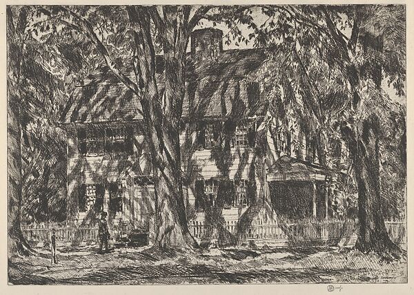 The celebrated American Impressionist Childe Hassam made his first etchings in 1898 but began to seriously focus on the medium in 1915. He made this image of a nineteenth-century wooden house shortly after buying a property in East Hampton in 1919. While the print ostensibly responds to nineteenth-century architecture and ancient trees, the print's greatest impact comes from its expressive style. Working in monochrome allowed the artist Hassam to emphasize bold surface patterns and to weave effects from the leaves and branches, an expressionism also evident in Hassam's oils of the period.