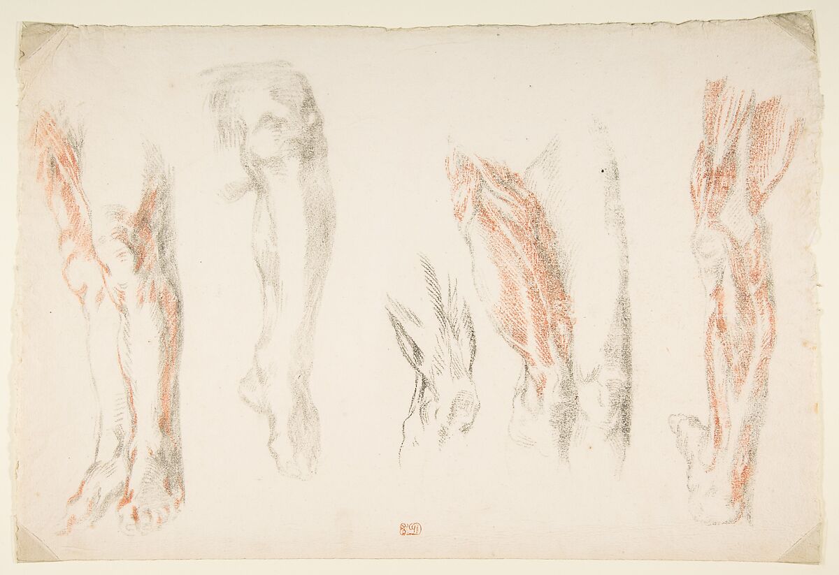 - Medium: Counterproof of a drawing in red and black chalk, with black chalk additions