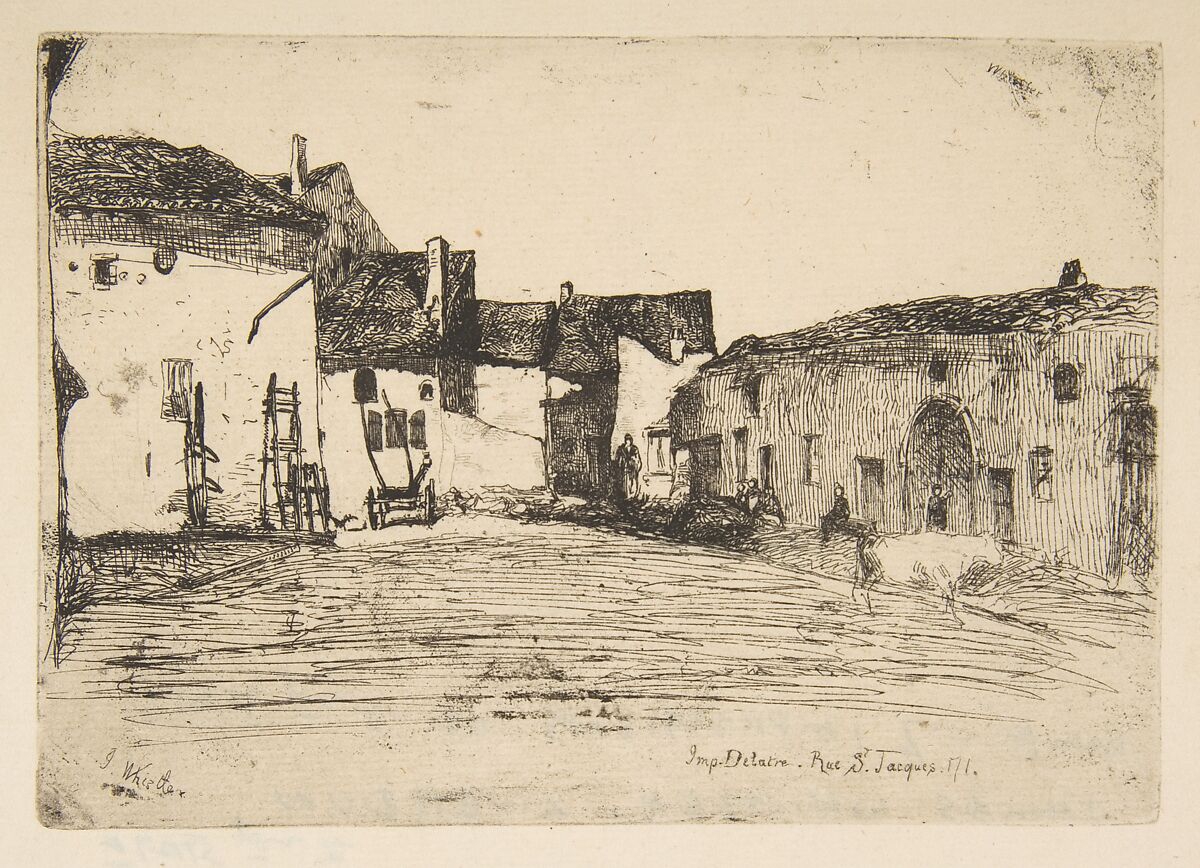 Whistler visited Liverdun, a town on the Moselle, near the start of a summer Rhineland tour in 1858. He traveled by train between Nancy and Strasbourg, making sketches and a few etchings, including the present work. Here, old farm buildings frame a yard and establish what would become a favorite formal arrangement. Roofs and walls are punctuated with shadowed openings to create a play of lights and darks enlivened with the lightly etched forms of farm workers, ladders and a cart. A white cow walks out of the space at right, and broad expanses below and above suggest ground and sky. This composition was one included in "Douze eau-fortes d'apres Nature" (known as the "French Set"), the artist's first published work, issued in November 1858.