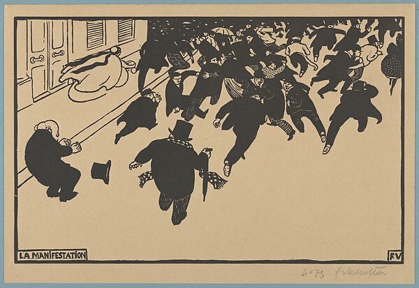 The aesthetics and politics of urban crowds attracted Vallotton as a recurrent subject in the early 1890s. For this scene of a dispersing demonstration, the artist effectively exploited the economy of the black-and-white woodcut medium, balancing the density of the hastening crowd in the upper third of the composition with the radical blank space below. The approaching authorities remain out of the frame, though their presence is inferred by the reactions of the fleeing protestors. Vallotton also omits any reference to specific cause, which made the work more palatable to a broad audience. It was included in one of the most significant avant-garde print projects of the fin de siècle, André Marty’s L’Estampe originale (1893–95).