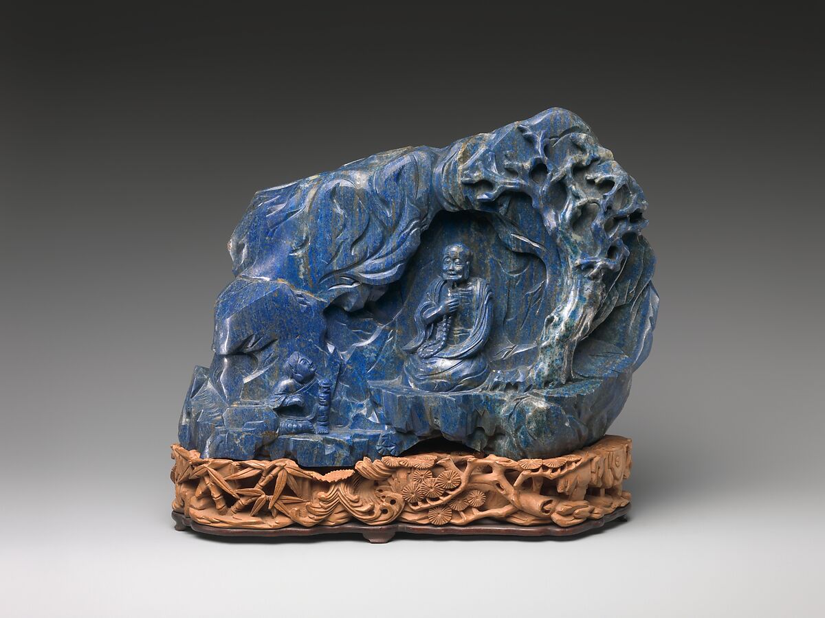 This superb sculpture of lapis lazuli depicts a Buddhist sage meditating in a rocky cave under a craggy tree. The master carver demonstrated his formidable skill by managing to turn the large light gray blotches of the stone into the gnarled tree trunk and the whitish spots into the highlights on the monk’s face.