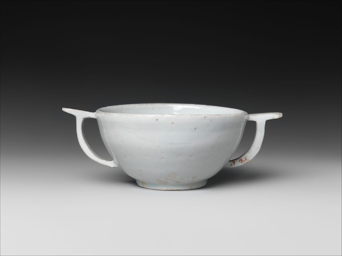 The cup here, used in Confucian ancestral rites, may have been placed atop a flat-rimmed porcelain dish, such as 2004.124. Both objects, produced at the court kilns (Bunwon), demonstrate the neo-Confucian elite’s taste for unadorned white porcelain during the Joseon period.