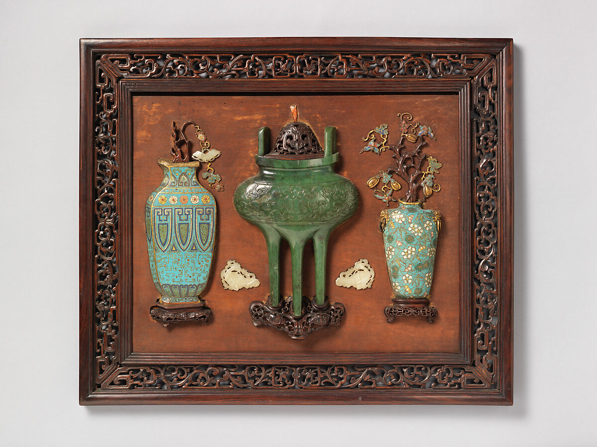 The “hundred antiques” pattern became popular in China in the seventeenth century. It often features antiques, ornamental vessels, and scholar’s accessories in various media, resulting in a colorful, playful surface. Here, spinach jade represents an ancient bronze tripod with green patina, while cloisonné mimics both an archaic bronze pattern on the left and a contemporary porcelain pattern on the right.
