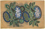 Pattern with Cellular Ovals and Blue Ovals with White Designs, Separated by Decorative Leaves, from a group of 158 textile designs from an unidentified French designer. The designs include brightly colored patterns and single motifs in late Art Nouveau and Art Deco styles. Most designs have been made on tracing paper and show signs of transfer. Some include instructions for execution, written in French.