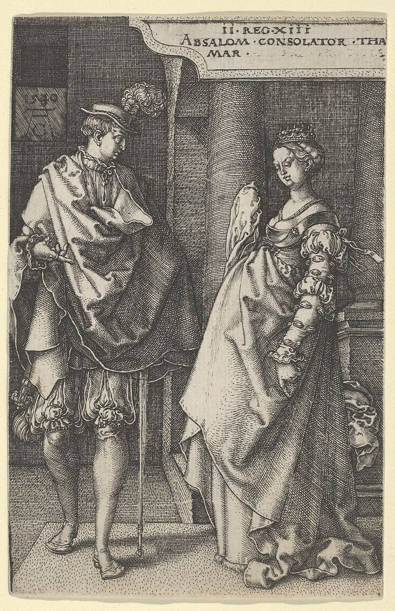 Absalom, in a feathered hat at left, comforts Tamar, who stands facing him at right. Based on 2 Samuel 13:20. Plate 4 from a series of seven plates with the Story of Amnon and Tamar.