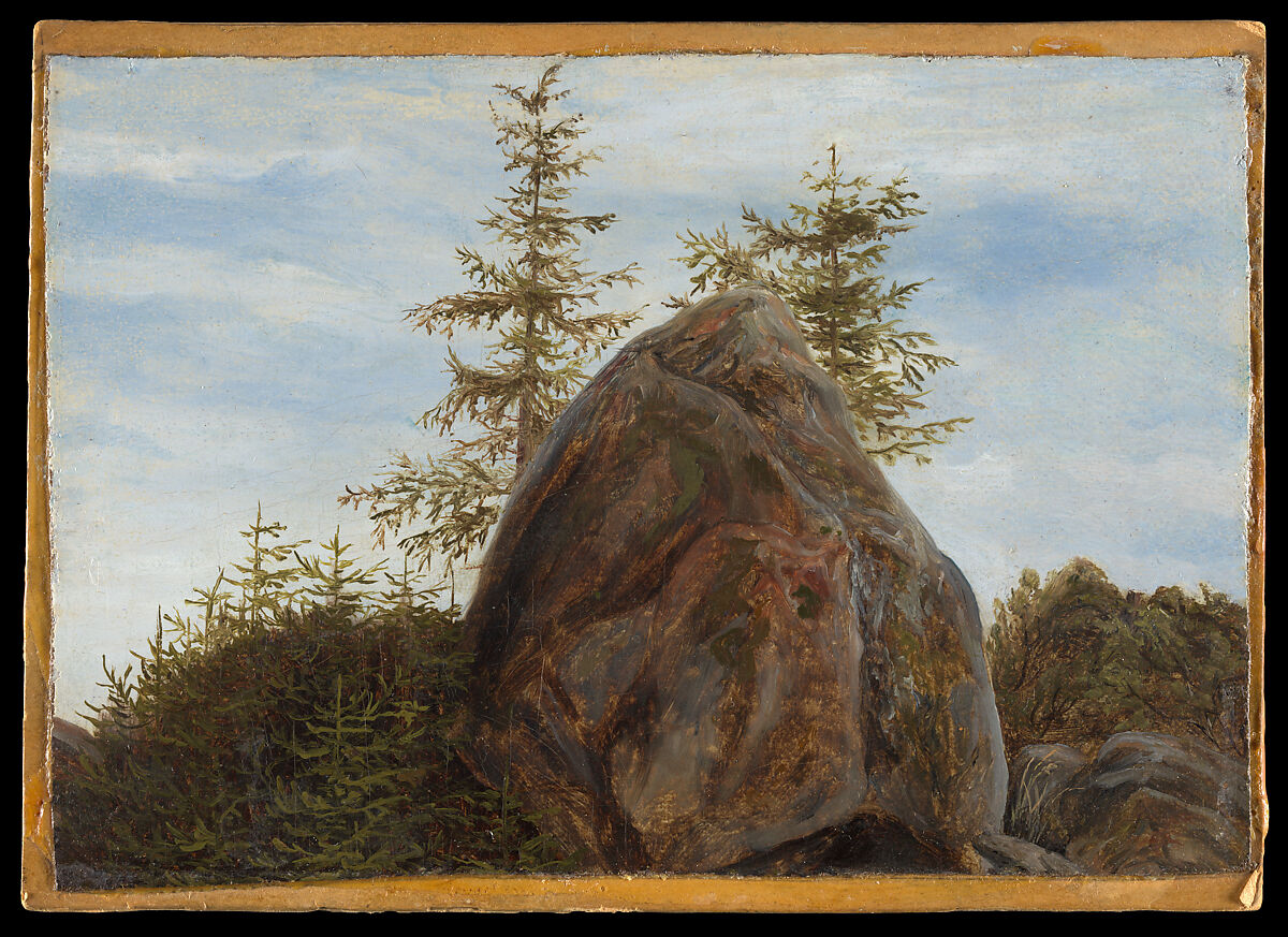 The strikingly large scale of this boulder relative to its setting betrays the influence of both Johan Christian Dahl, with whom Fearnley studied in Dresden in 1829–30, and Dahl’s neighbor, Caspar David Friedrich. This study may document one of the rock formations in the terrain southeast of Dresden, or the site might be in Norway, where Fearnley was born and raised.