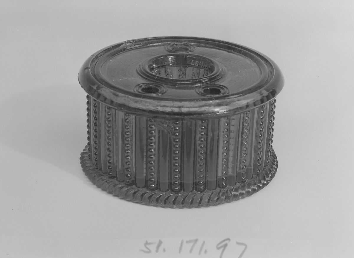 This inkwell, pressed in a reeded and beaded design, is also ribbed inside on the top and base.