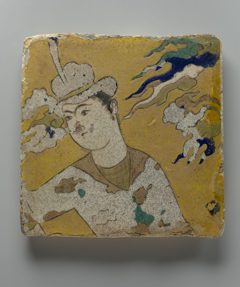 This tile, depicting a male youth with delicate features, would originally have been part of a much larger panel, most likely depicting an outdoor banquet. The rendering of this figure is consistent with contemporary painting, a connection that illustrates the relationship between the royal workshops for bookmaking and those for ceramics. The graceful lines which form the details in the face and hair of this figure are akin to those created by brush or pen by artists working on paper. Rather than wearing a Persian turban, this figure is depicted wearing a European-style hat, highlighting the cosmopolitan nature of 17th century Iran.