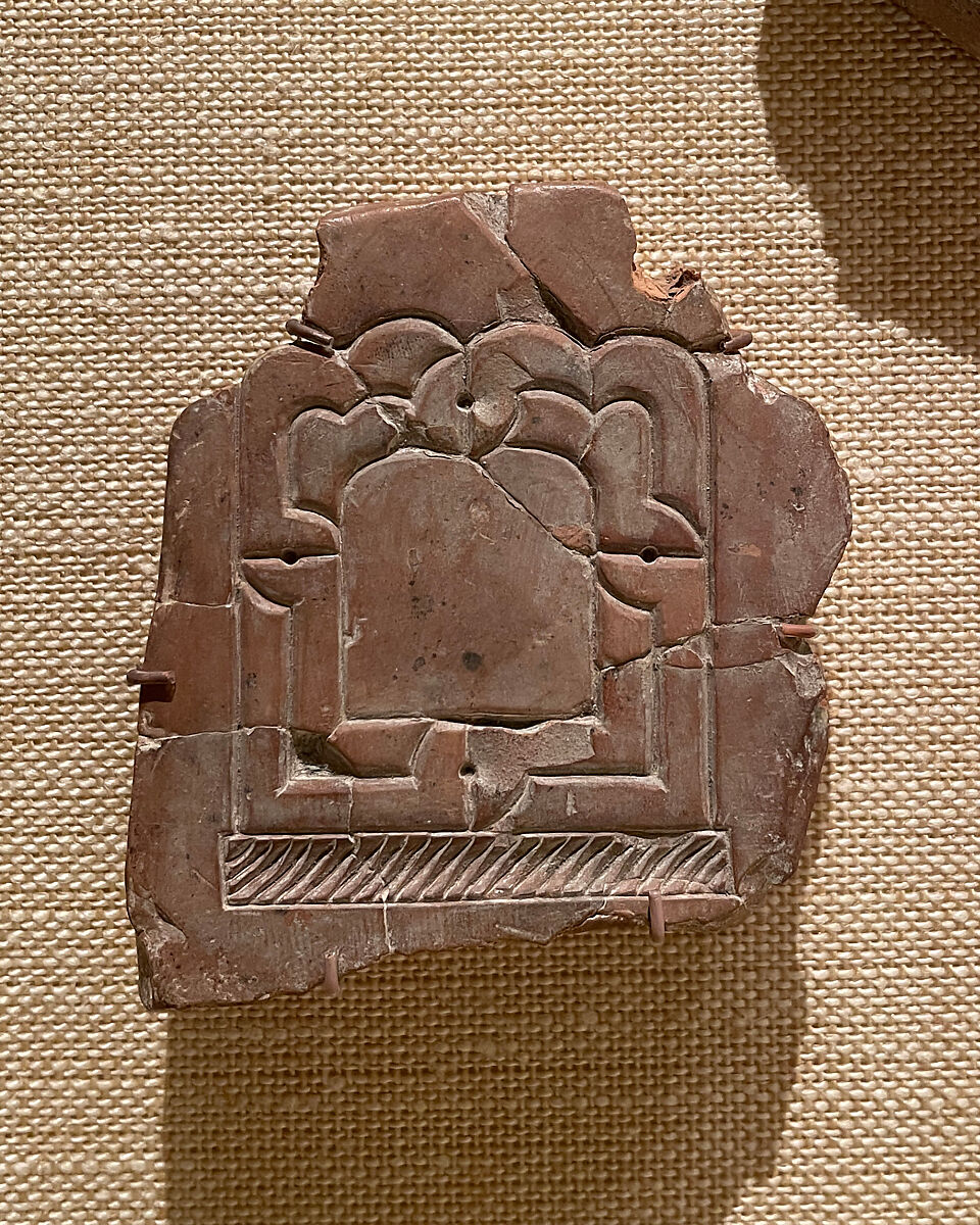 As part of the larger "Persian Expedition" project at Nishapur, American archaeologists and hundreds of Iranian workers excavated a mound named Tepe Madrasa. There, they uncovered an architectural complex which they tentatively associated with a palace or governmental center because of the solidity of the built structures and the extent and variety of wall decorations (including carved and painted brickwork, glazed tiles, wall paintings, and carved and painted stuccoes). This, together with the ceramic and metal finds, aided in attributing the site to the ninth or tenth century onwards. A mosque, refurbished multiple times up to the late eleventh century, was also unearthed, yielding the remains of a monumental entrance with a large terracotta inscription bearing the titles of a sultan (39.40.58, .60–64). Several twelfth century tombstones were also unearthed, showing the shift in purpose of what was earlier a residential area.