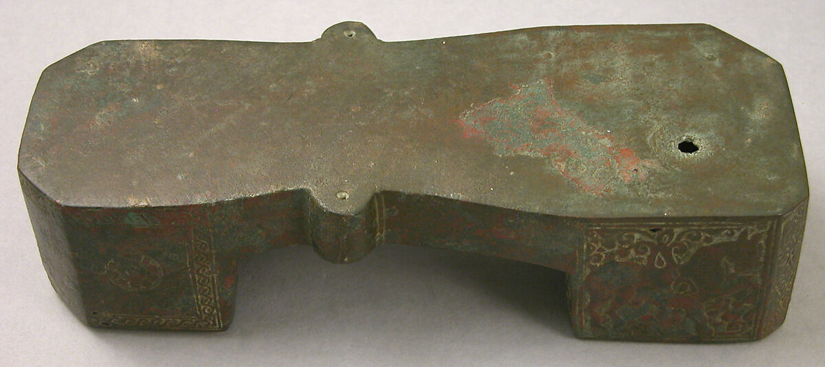 Clogs were commonly used in hammams, or baths, a common institution throughout the Middle East. They were made of wood; this rare example in incised decorated bronze—heavy and awkward to wear—must have had ceremonial or symbolic significance. It is signed by Abu Nasr.