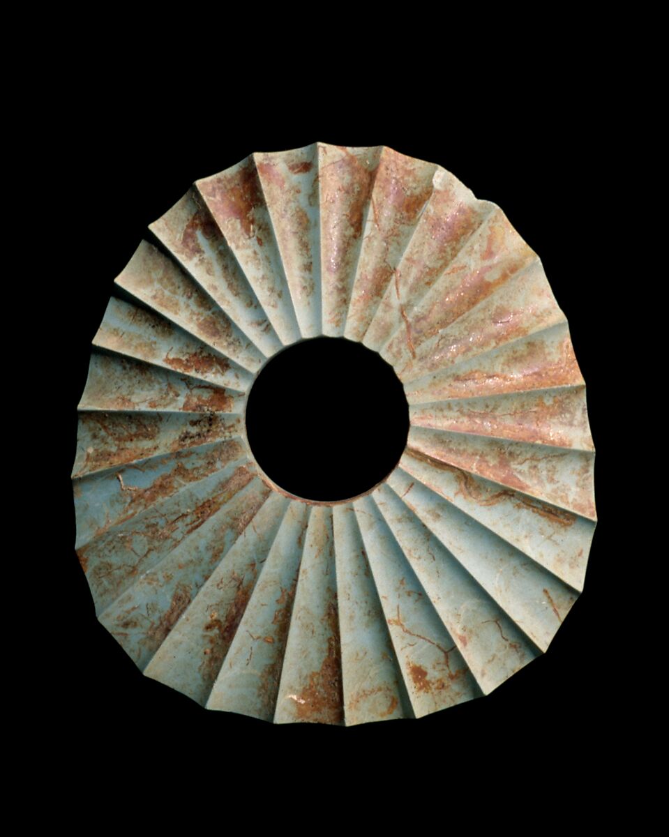This irregular disk with smooth radial fluting is a fine example of a type of carved stone object found in the keyhole-shaped burial mounds of central Japan from the fourth and fifth centuries. Works in this shape are called sharinseki (carriage-wheel stones) and are sometimes identified as stone bracelets. They seem, however, to be talismans with magical or religious significance. They do not appear in burials of the later Kofun period; perhaps their special meaning faded with the influx of Chinese and subsequently Buddhist culture that began in the sixth century.