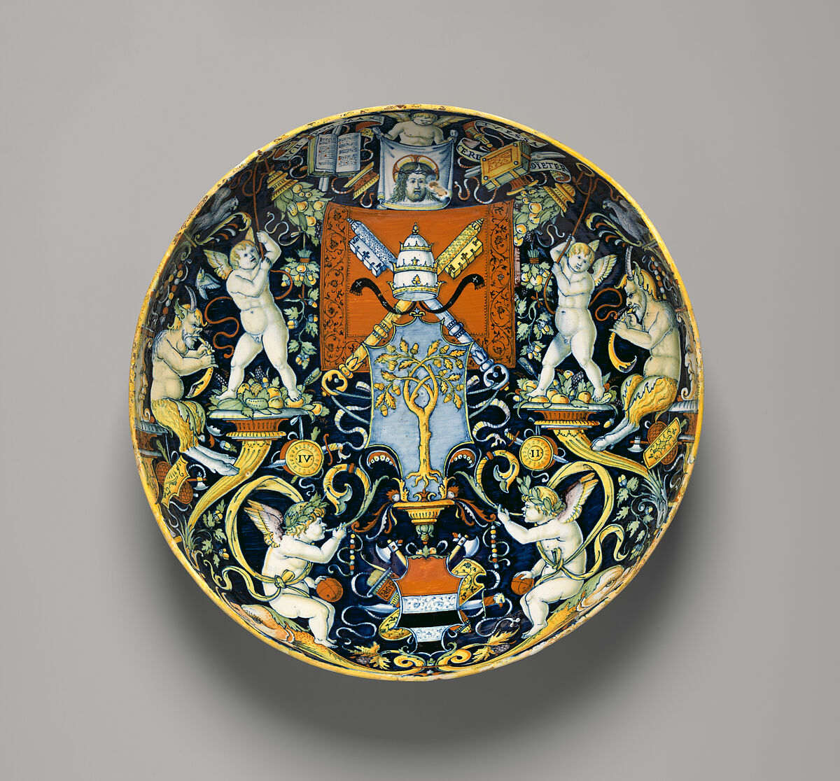 世界で最も美しいマジョリカ陶器(精製錫釉陶器)の作例とされているこの鉢は、ローマ教皇の権威の象徴である鍵、ティアラ、そしてローマ教皇ユリウス2世(ジュリアーノ・デッラ・ロベーレ)とその家族を表した樫の木など個人的なシンボルで見事に装飾されています。ユリウスはおそらく、1506年のボローニャに対するバチカンの権威回復を記念し、ボローニャ大使メルキオーレ・ディ・ジョルジオ・メンゾーリ(紋章が左端にある)のためにこれを作らせたと考えられています。また、裏面に名前があるジョヴァンニ・マリア・ヴァザーロは、この作品の絵付け師、またはカステル・ドゥランテの工房の経営者だったと思われます。