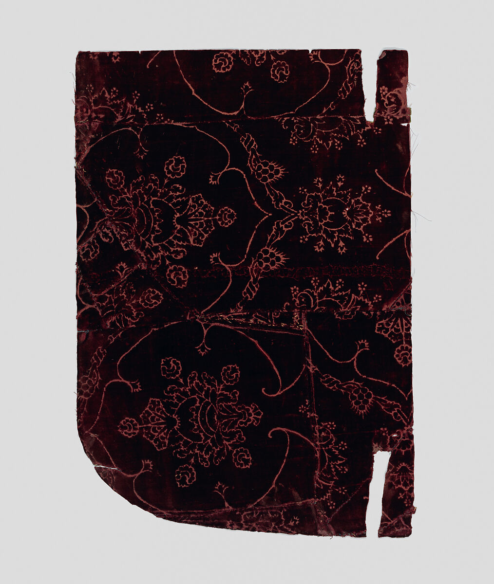 This fragment of a chasuble (a liturgical garment used in the celebration of the Mass), together with another fragment in the Lehman Collection (1975.1.1878B) are of a dark red silk cut voided velvet, patterned in an allover straight vertical repeat of a five-lobed shape filled with a stylized plant with buds projecting into the lobes. Above the top lobe a smaller version of the plant grows from a branch with a curling cluster of berries and adouble knotting device. Additional stylized plants reminiscent of pomegranates fill the voids between the pattern repeats.