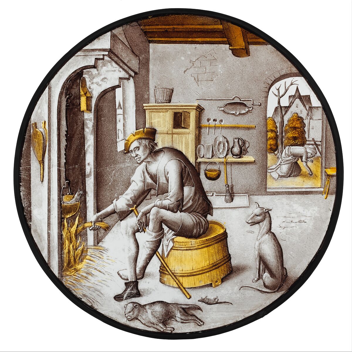 Here, Sorgheloos sits forlornly on an upended washtub before a boiling kettle of herring a barren, crumbling house. His only companion (besides a pitiable dog and cat) is Poverty, who can be seen through the doorway gleaning straw to feed the fire. The roundel's execution—in several tones of paint, ranging from pale umber to dark brown, and three hues of silver stain, from pale yellow to coppery brown—is unusually accomplished. The mattes were extensively worked with a badger brush to produce subtle tonal gradations. Details and outlines were added with both a stylus and the tip of a brush.