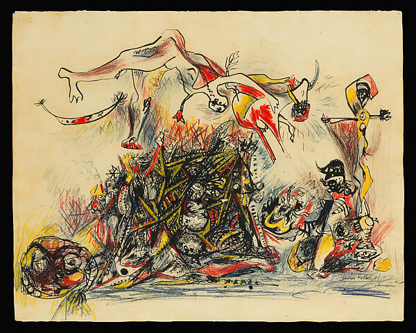 Pollock's famous War is the only drawing he ever titled, and, although inscribed "1947," it relates to the iconographically complex images he produced earlier, around 1943–44. In this composition, the monstrous destruction of war is conveyed both by the fierceness of the graphic execution and by the imagery, much of which is camouflaged by the many linear motions, darkened and thickened and highlighted with flashes of red and yellow pencil to heighten the dramatic intensity. The drawing's narrative is one of horrific proportions. A human figure and a bull are flung onto a raging pyre of human debris. To the right, the crucifixion of a hooded figure is suggested. Some of the imagery may be traced to Picasso's pair of etchings The Dream and Lie of Franco, and to the Spanish artist's epic painting on war, Guernica, both from 1937. Yet even as Pollock's work engages with the history of art and offers a statement on the universal horrors of war, it also has a personal dimension, drawing on from the psychological language of Surrealism that fueled his early works.