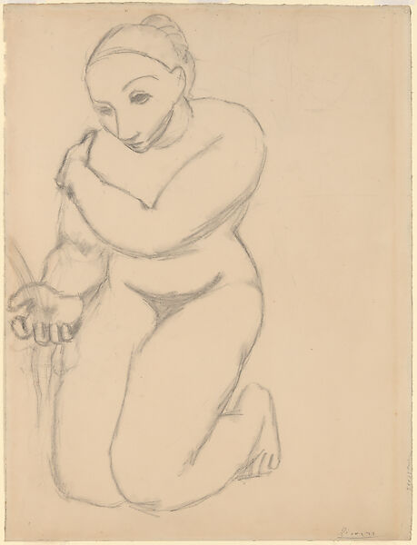 A typhus scare prompted Picasso's abrupt return to Paris from Gósol in August 1906, where he continued to work on projects he had begun in Spain. This drawing reveals the multiple sources that Picasso consulted and combined at this moment. The pretext of the composition—a female bather at a fountain—derives from Ingres and relates to The Harem (1906, Cleveland Museum of Art), Picasso's free reworking of Ingres's Turkish Bath (1862, Musée du Louvre, Paris) and La Source (1856, Musée d'Orsay, Paris). The compact forms and compositional clarity recall Puvis de Chavannes, but the splayed pose and archaizing features point to Gauguin. In particular, Picasso may have been thinking of a Gauguin watercolor that belonged to his friend the sculptor Paco Durrio, in whose studio he was working in autumn 1906.