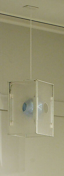 The Irish-born Gray moved to France in 1907, where she spent the rest of her life working as a designer and architect. Her early work was luxurious, expensive, and one-of-a-kind, principally made for private clients like the couturier Jacques Doucet. Between 1922 and 1930 she ran a shop in Paris called Jean Désert, where she sold her designs; during this period her aesthetic shifted from luxury to a more industrial functionalism that culminated in her spare architectural work of the 1930s. This pair of lanterns is part of a series of hanging lights she produced during the late 1920s; earlier examples were made from lacquered metal, ostrich eggs, or colored glass, while later examples like these incorporated humbler industrial materials like Perspex, painted metal, and the mirrored glass balls that serve as reflectors for concealed lightbulbs.