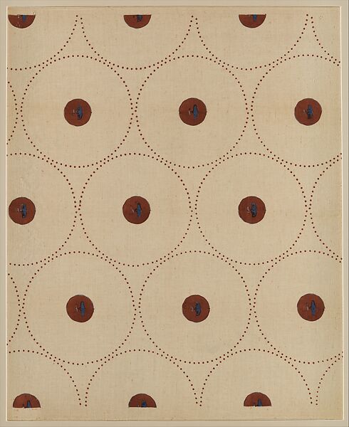 Ruhlmann used the same basic motif—a stylized Cedar of Lebanon tree set within an irregular circle—on this textile and related wallpaper (MMA 2005.334), though on the textile each motif is offset by an added circle of dots. The pattern was produced in alternate colorways.