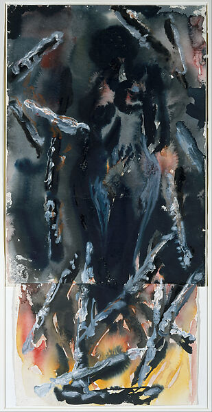 In Wagner’s version of the Nibelung saga, the lust for wealth and power conflicts with the search for love. The former is symbolized by a magic ring fashioned from gold that was stolen from the Rhine maidens; the latter is personified by the romance of the hero Siegfried and the Valkyrie Brünnhilde. Tricked by the cursed ring, the lovers die, Brünnhilde in a form of self-sacrifice atop Siegfried’s funeral pyre. In Kiefer’s drawing, watercolor and acrylic are used to represent both flame and ash, as well as the waters of the Rhine that rise up to extinguish the flames.