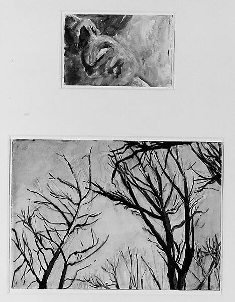 Referencing myth, literature, and the history of art, Kiefer has often used landscape to instigate cultural memory. In Autumn Forest, the artist paired a small watercolor of the partial face of a reclining woman with a larger sheet depicting cropped, leafless trees near the Rhine, a historical symbol of German nationalism. Placed above the landscape, the woman’s face personifies the sky, as in love poetry. Together, the works and the interval between them make us aware of the associations we may bring to such images, whether or not they are presented by the artist.