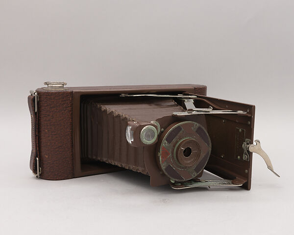 In 1928, Eastman Kodak Company gave Walter Dorwin Teague his first major contract; he had established his studio in New York City two years earlier. The partnership continued until Teague’s death, and he designed a number of cameras for Kodak, including the Baby Brownie (1934), the Bantam Special (1936), and the Brownie Hawk Eye (1950). This model is a version of the No. 1A Pocket Kodak Jr., a self-erecting, folding camera. An earlier version, the Vest Pocket Kodak (1912), had been popular with soldiers during the First World War because of its quality and portability. After the war, it was redesigned and mass-marketed as an inexpensive, easy-to-use consumer camera. For the 1930 holiday season, Kodak asked Teague to redesign the model’s faceplate and box, which were usually solid black. Taking visual cues from Art Deco, a popular style in the late 1920s, Teague created a pattern of interlocking geometric shapes in black, brown, silver, and red, recalling the work of modernist painters, such as Mondrian. The camera reflects a convergence of art and industry. In a 1930 advertisement in the New York Times, Kodak termed the camera "One of the finest looking Kodaks ever offered."