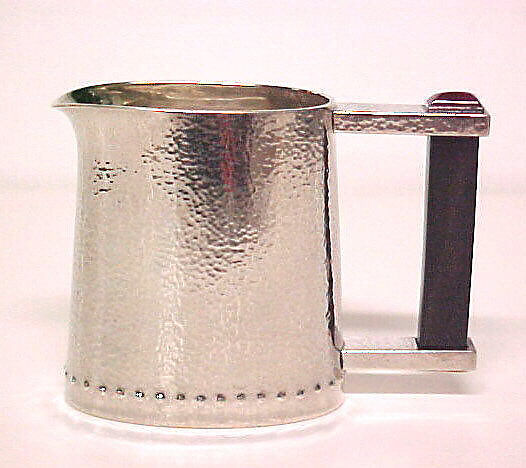 This creamer is part of a hand-beaten silver tea service designed for the Wiener Werkstätte. Co-founded by Josef Hoffmann in Vienna, this community of designers, artists, and craftsmen included Gustav Klimt, Josef Frank, and Egon Schiele. In this elegant set touched with semiprecious stones and ebony, Hoffmann has integrated luxury materials with forms of uncompromising austerity: straight sides, domed lids, and squared-off handles. The only decoration, except for the inset jewels, is the single thin horizontal line of raised dots near the bottom of each container. For information on the full service, see MMA 2000.278.1-.9.