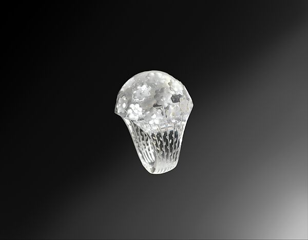 While Lalique’s early turn-of-the-century incorporation of glass in jewelry was somewhat timid, he eventually created designs made entirely from the material. In so doing, he raised the public conception of glass from a utilitarian commodity to a luxury material. His witty colored glass rings, which were informal fashion accessories rather than real jewels for evening wear—suggest cabochon gems such as sapphires, crystals, or moonstones and indeed would have been looked upon as nearly as desirable. Each was cast in a pressure mold and hand engraved