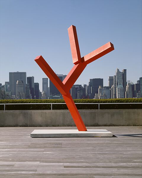 Shapiro, who has lived and worked in New York for the majority of his career, is known for sculpture that makes use of found and cut rectangular and square planks and beams of wood in a multitude of scales, from intimate to monumental, either leaving the elements in raw form or casting them in metal. Taking inspiration from modernist assemblage—from Pablo Picasso and Julio Gonzalez to Vladimir Tatlin—the artist constructs these elements into forms that are rooted in both geometric abstraction and the figurative tradition. His additions of layers of vibrant color—here, Shapiro used rich oil paint in cadmium red and vermilion hues—are also often inspired by art-historical precedent, in particular modernist painters such as Piet Mondrian and Chaim Soutine. This monumental work was first debuted as part of Shapiro’s solo exhibition on The Met’s Iris and B. Gerald Cantor Roof Garden in 2001, the year it was first constructed and cast.