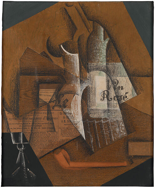 In place of the virtuoso imitations of materials and textures created by seventeenth-century Dutch and Spanish painters, Gris relied on wood-grain wallpaper, a cutting from Le Matin, Scaferlati tobacco packaging, and the top of a box of matches. The fancy lettering of the “Vin Rosé” label was his own handiwork, however. Complementing the impression of a dimly lit table at night, the leading report in the newspaper concerns the strikes and power cuts that had formerly plunged Paris into darkness. Scaferlati tobacco was nicknamed “le cube gris” because of the cubic form of its grayish package; incorporated into his collages, it served as a punning substitute for Gris’s missing signature.