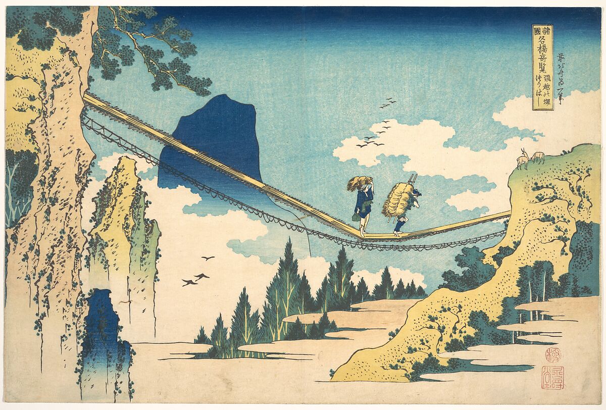 - Title: The Suspension Bridge on the Border of Hida and Etchū Provinces (Hietsu no sakai tsuribashi), from the series Remarkable Views of Bridges in Various Provinces (Shokoku meikyō kiran)