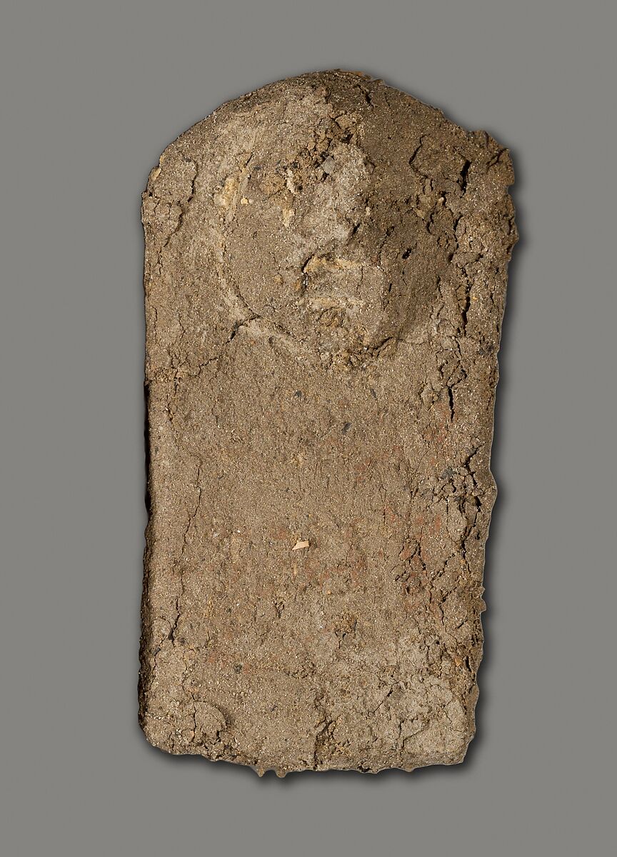 These tablets of unfired clay with attached crude faces were found as a group by the Museum's excavators at Lisht South in loose surface sand west of the mastaba of Senwosretankh, a high official and possibly the architect of the pyramid complex of Senwosret I (ca. 1961–1917 B. C.), east of which he erected his own very elaborate mastaba tomb (see acc. nos. 33.1.2 and other pieces). The mud figures and little coffin (acc. no. 33.1.66) that had contained some of them must have been buried, however, considerably later than the early twelfth dynasty tomb close to which they were found. In fact, during the thirteenth and following dynasties people deposited a number of objects in the by then sacred area around a legendary ruler's pyramid and its dependant monuments, believing conceivably that potent magical powers could thus be released. These flat mud figures, for instance, are inscribed in now much-faded red paint with the names of men identified as enemies (most of them Egyptians but some with foreign names). Their deposition may have been thought to effect their destruction.
