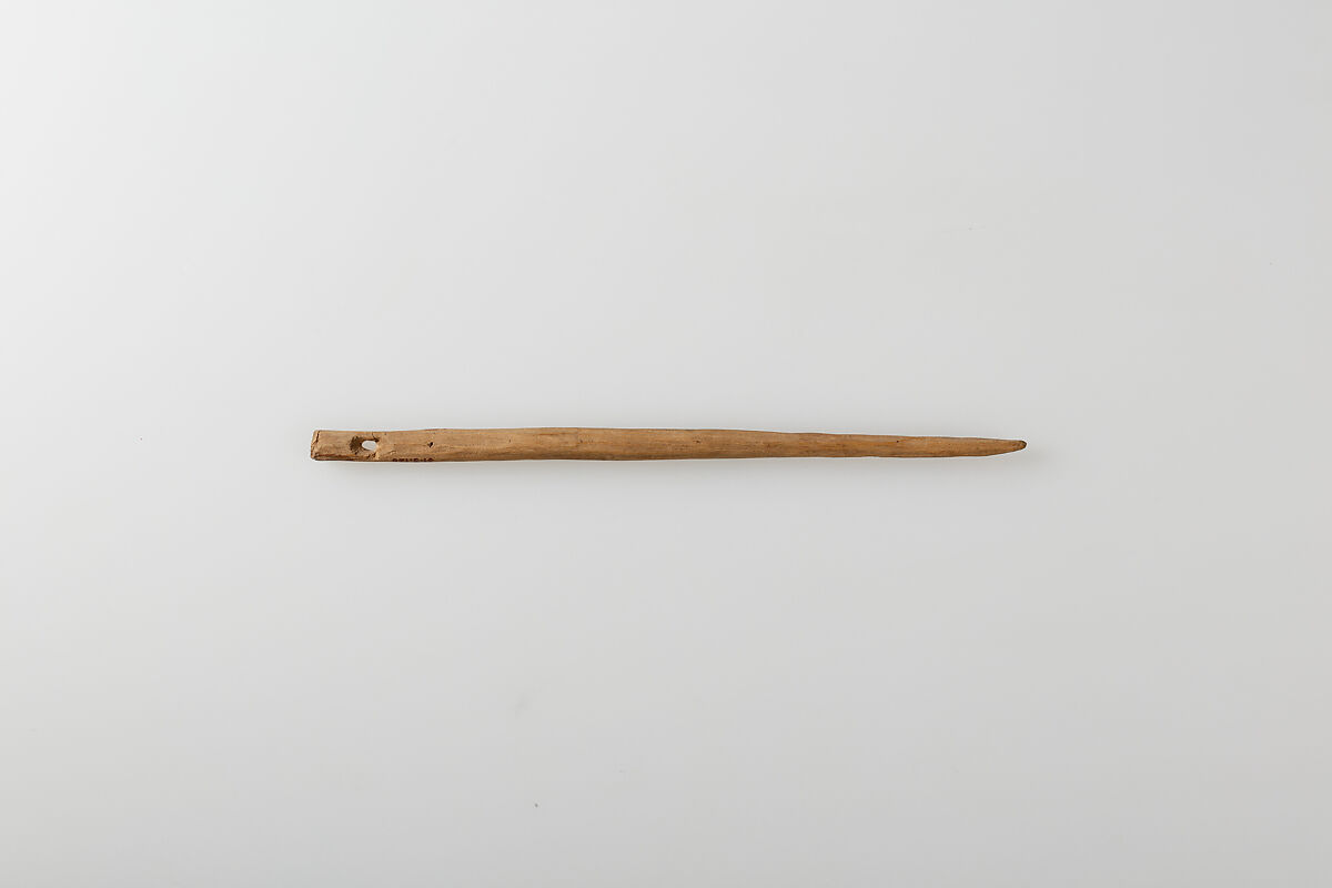 Roughly whittled from wood, this large needle was discovered in a cache of embalming material buried in the Theban necropolis. It had been stuck into the edge of a grass mat that had been made into a basket.