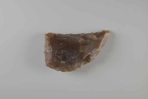 This small piece of flint was a key element to a successful agricultural season in ancient Egypt. Grain was a staple of the economy, as bread and beer made from grain were consumed daily. They also formed the foundation of eternal sustenance, as funerary offerings. Ancient Egyptians used sickles made from flint and wood to reap grain. Pieces of flint such as this one were shaped to fit into a wooden haft along with a number of other such inserts, and secured with an adhesive. The flint pieces provided a sharp edge to cut the grain stalks. With use, the flint would wear down and develop a shiny gloss. The flint inserts could be re-sharpened or replaced as needed.