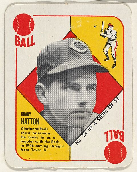 - Title: Card Number 34, Grady Hatton, 3rd Base, Cincinnati Reds, from the Topps Red/ Blue Backs series (R414-5) issued by Topps Chewing Gum Company