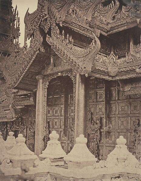 This work of art is currently on loan to the museum.This photograph shows the eastern entrance to the Royal Daughter’s Monastery, built as a pious offering by the queen during King Pagan’s rule (1846–52). Only the highest ranking patrons could afford the expense of building such a richly ornamented monastery. Tripe’s oblique view of the most important entrance to the monastic residence, beneath a soaring, elaborate multitiered spired roof (pyatthat), emphasizes the complexity of its wood carving, which was embellished with mirrors and gilding.