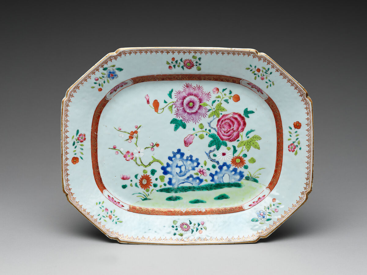 Chinese export porcelain was one of the luxuries deemed essential to a well-appointed eighteenth-century house. Until 1784, when direct trade began between China and America, Chinese porcelain came to the colonies by way of Europe. This platter was part of a large service that descended in the Verplanck family of New York.