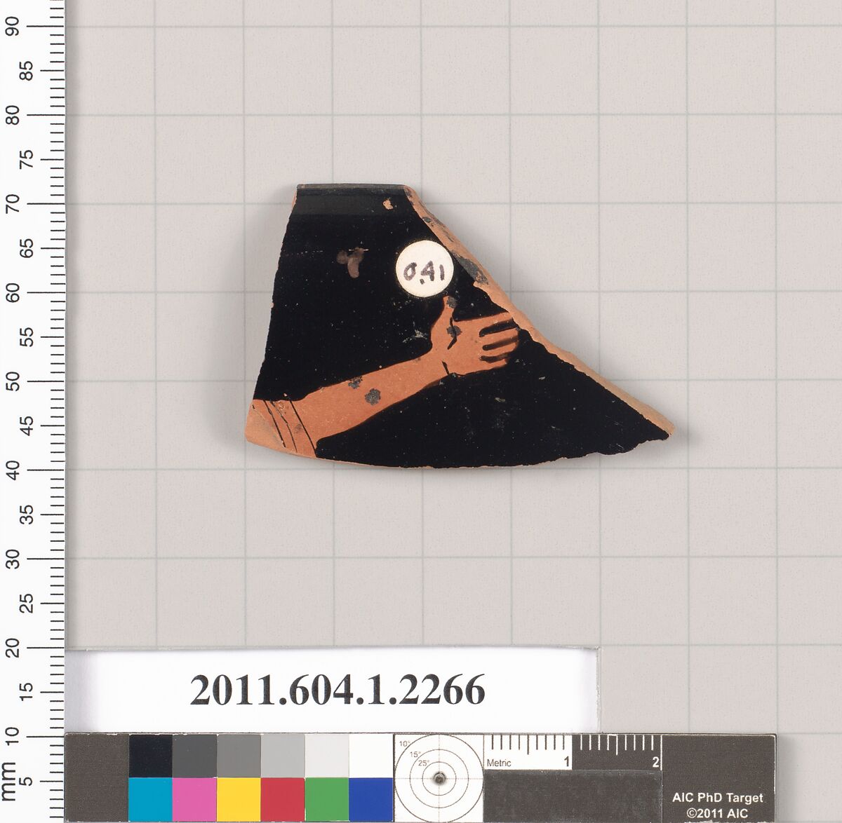Exterior, drapery and extended left arm of woman; above arm, one letter of an inscription, an upsilon