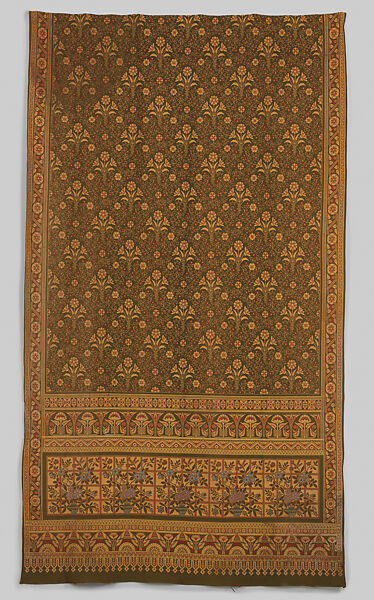 This portière is an example of the popular woven wool hangings that were produced by the J & S Templeton firm in Glasgow from the 1860s; these were considered innovative technical tours de force for their successful weaving of such a large and complicated pattern in one piece. Talbert had a fruitful collaboration with Templeton, and his eclectic design takes full advantage of the jacquard weaving capabilities. Not only does the pattern change over the length of the curtain, the thread choices and structure are also skillfully employed to augment the complexity of the design and subtly emphasize certain motifs. To date, a design drawing for this portère has not been discovered.
